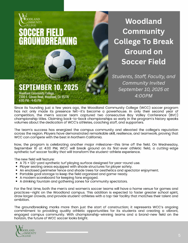 - WCC Soccer Field Groundbreaking – Join us on September 10 for this milestone event celebrating the start of construction for our first athletic field.