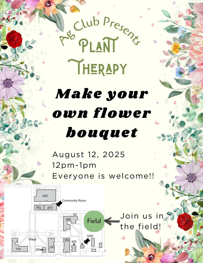 Take a break, relax, and let your creativity bloom! Join the Ag Club for a fun Plant Therapy session where you can make your own flower bouquet. All materials will be provided, and everyone is welcome to participate