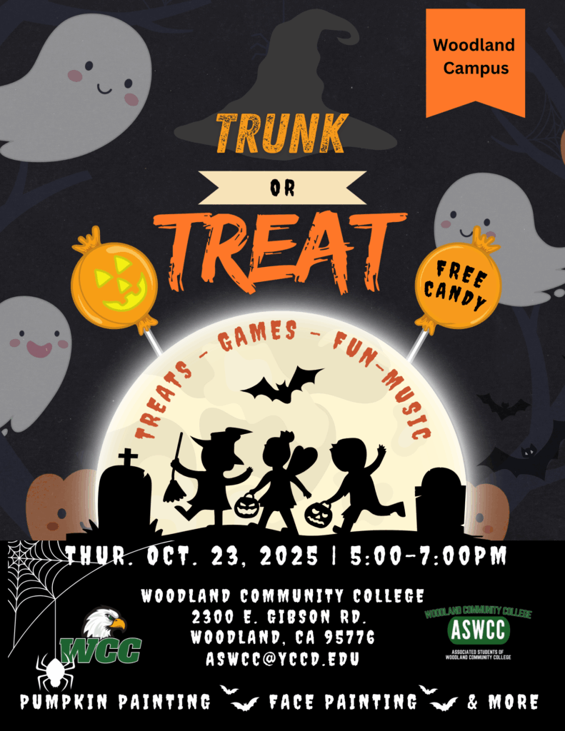 Join us for a spooktacular evening of fun at Woodland Community College! Enjoy treats, games, music, pumpkin painting, face painting, and more. Don’t forget your costume and candy bag!