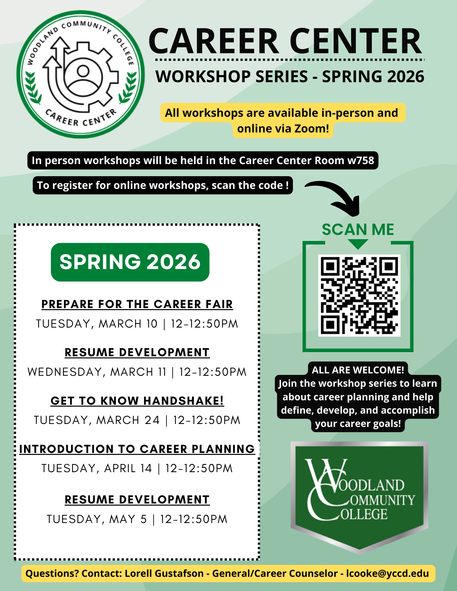 Workshops will be offered online via Zoom and in-person at the Career Center facilitated by Lorell Gustafson, WCC General/Career Counselor. To register for a workshop, click on the workshop title below. After you register, you will receive an email with Zoom information for the workshop. If you have any questions, please send me an email. I look forward to seeing you at the workshops! – Lorell Gustafson lcooke@yccd.edu.