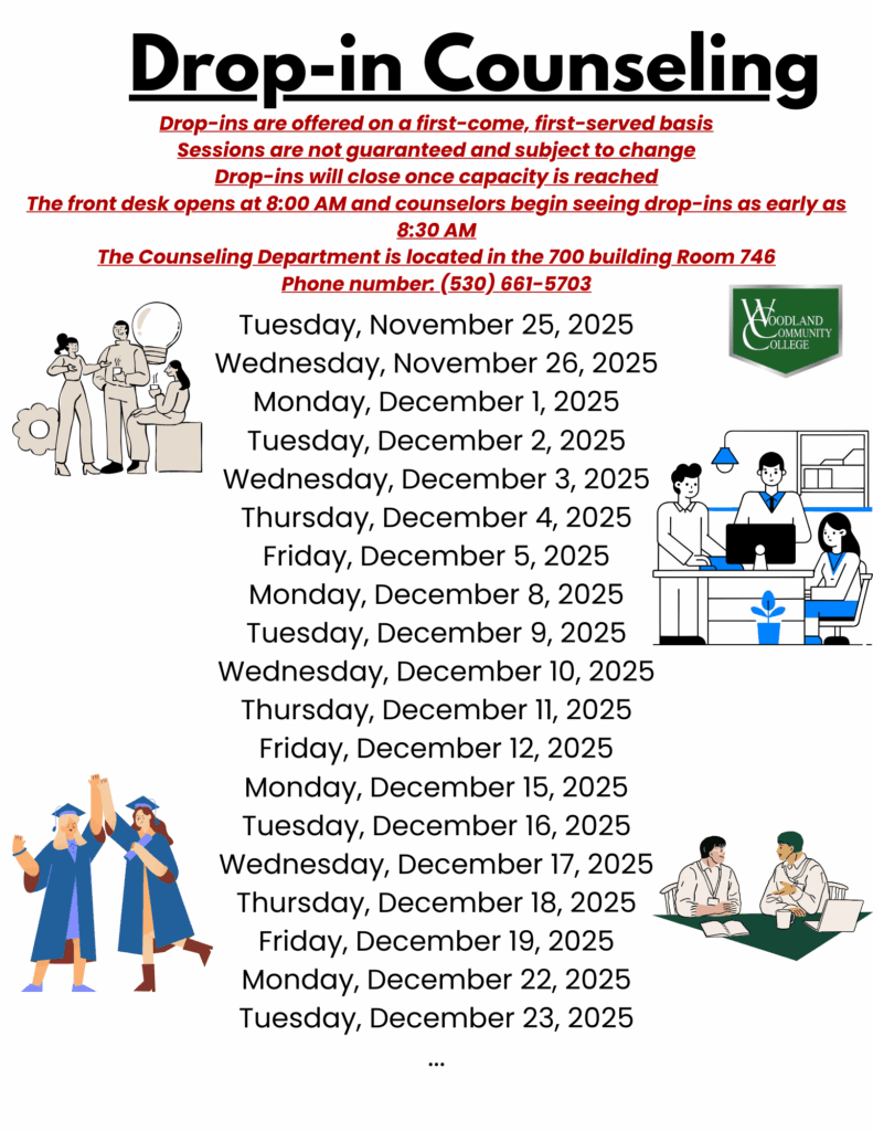 WCC students can meet with a counselor during Drop-in hours via Zoom, phone, or in-person. Contact your local campus or call the WCC Main Counseling Office at (530) 661-5703 to be added to the waitlist.