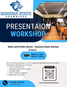 - Workshops: Presentations on a variety of topics including UC/CSU Transfer Requirements, Admissions Applications, and the UC Personal Insight & Transfer Guarantee are available throughout the year.